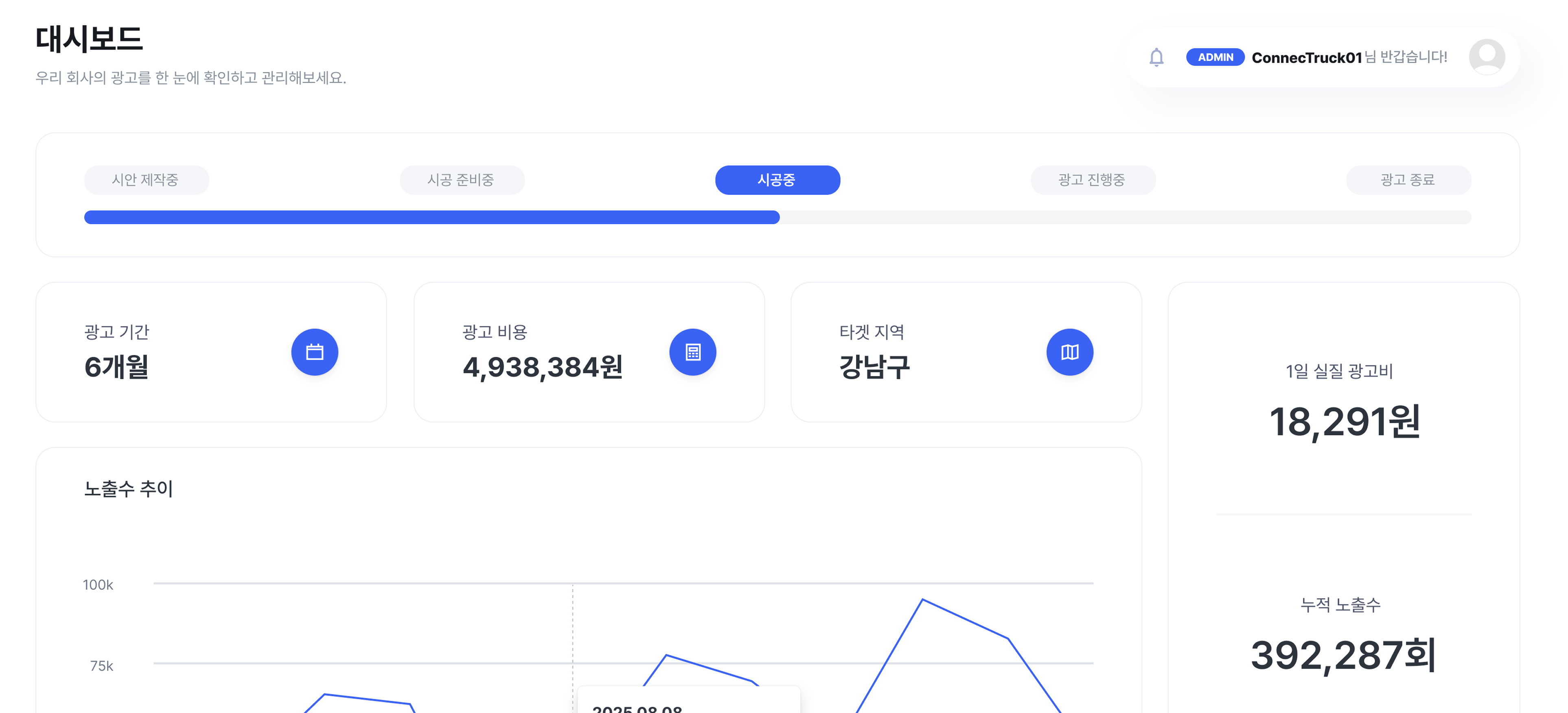 현재 운행 중인 광고 차량의위치와 상태를 확인할 수 있어요